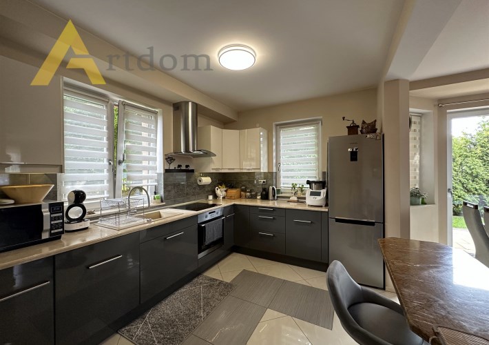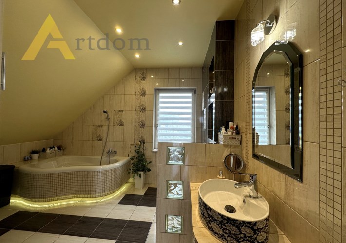Dom bardzo zadbany i w całości wyposażony. Centralnym punktem domu jest salon z klimatycznym kominkiem i jadalnią z wyjściem na taras. Kuchnia w nowoczesnej zabudowie meblowej i pełnej zabudowie AGD + spiżarka. Na wyposażeniu łazienek zarówno prysznic jak i wanna. Na górze miejsce do odpoczynku (tzw. pomieszczenie rekreacyjne), może służyć jako gabinet, biblioteczka lub można przerobić na dodatkową sypialnię. Na poddaszu znajduje się mały stryszek.
