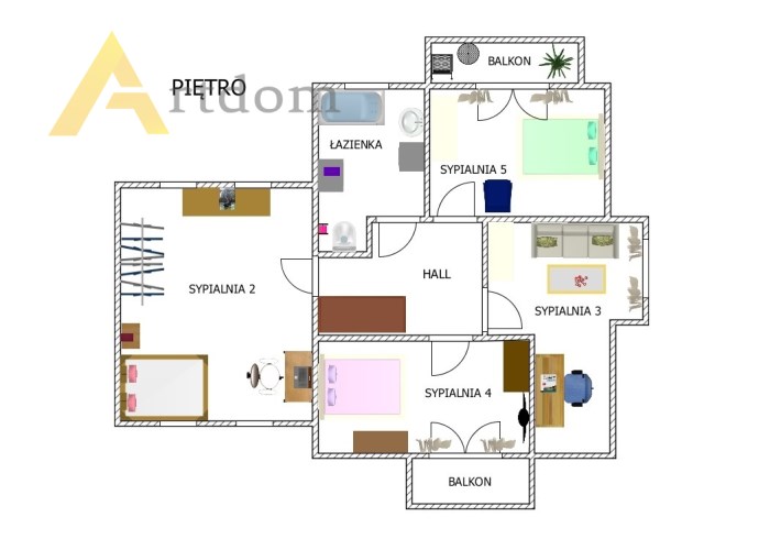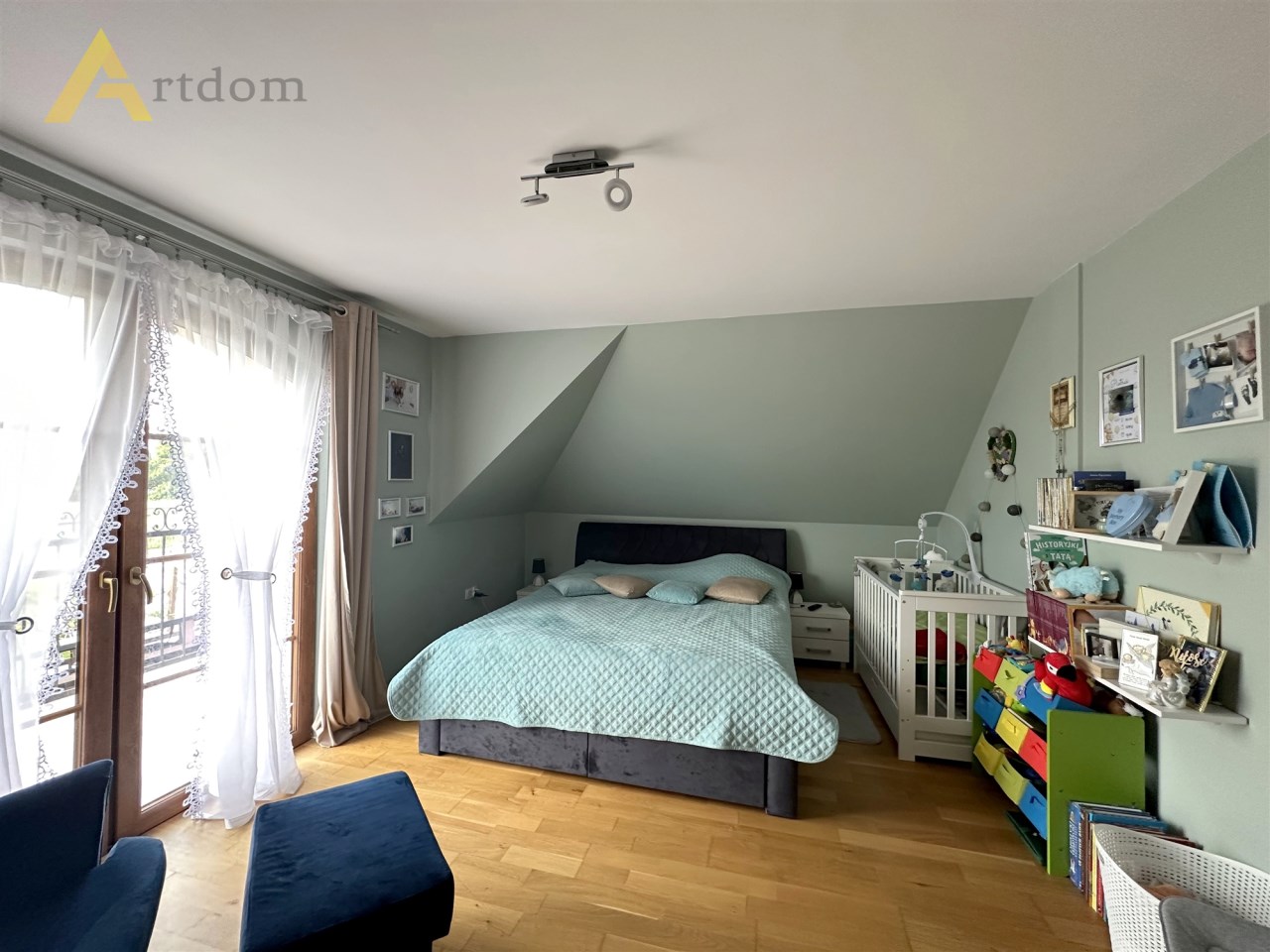 Piętro domu to 4 duże sypialnie z oknami zwykłymi, balkonowymi i dachowymi (lekkie skosy), duża łazienka (połączona z pralnią) z oknem i nowoczesną wanną, 2 balkony – od strony frontowej i ogrodu. Nad piętrem pomieszczenie strychowe.