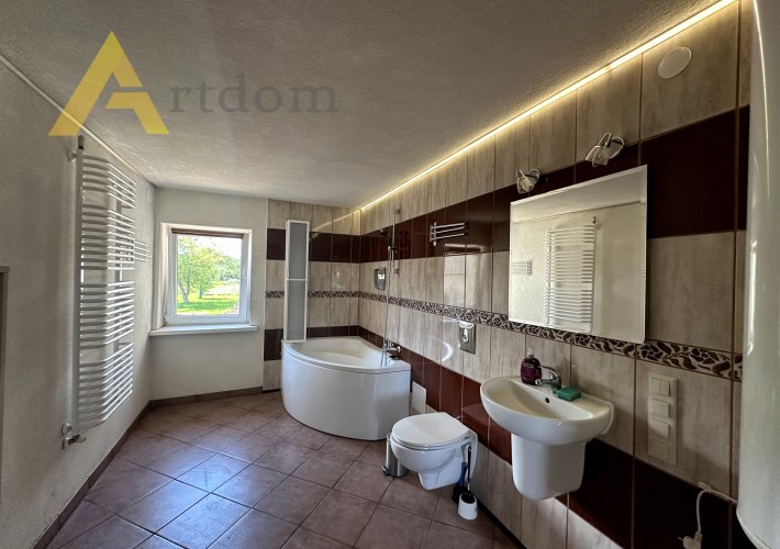 Część parterowa składa się z korytarzy, pracowni, przedpokoju, sypialni i łazienki z prysznicem. Na piętrze domu znajduje się druga, duża łazienka z ogrzewaniem podłogowym (elektrycznym), salon, kuchnia, 2 sypialnie, przedpokój i przeznaczony na biuro. Kuchnia w zabudowie meblowej ze sprzętem AGD: płyta główna z piekarnikiem, zmywarka, lodówka, kuchenka mikrofalowa.