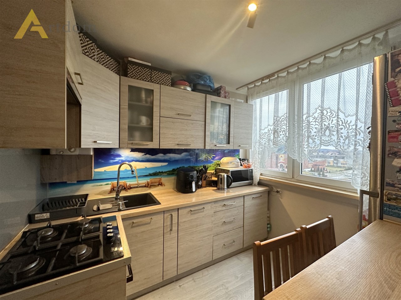 - ciekawy szklany panel nad blatem, dodający wnętrzu charakteru