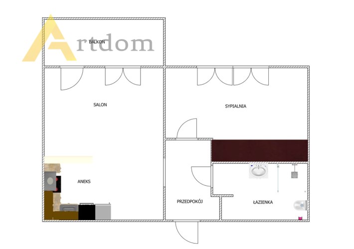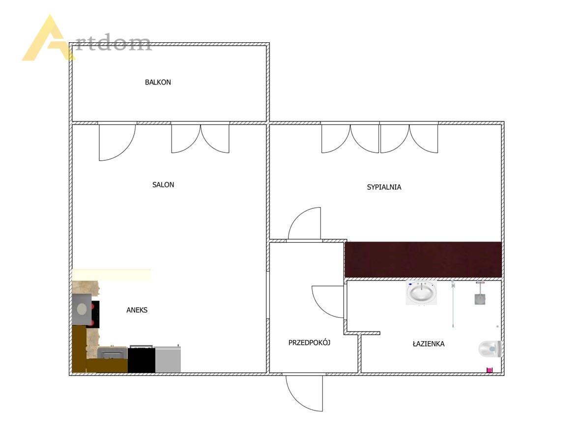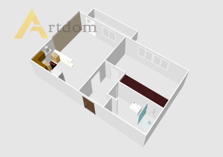 Lokal posiada 43,42 m2, składa się z salonu z aneksem kuchennym i wyjściem na duży balkon (6 m2) sypialni, łazienki z WC oraz przedpokoju.