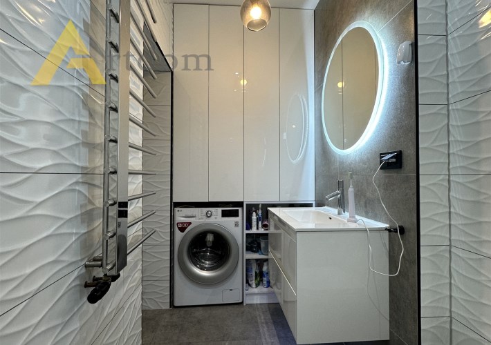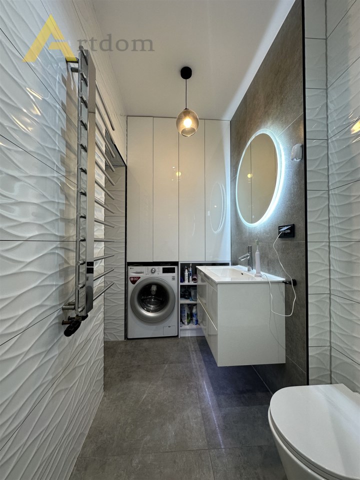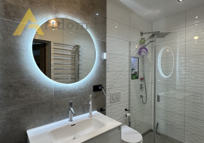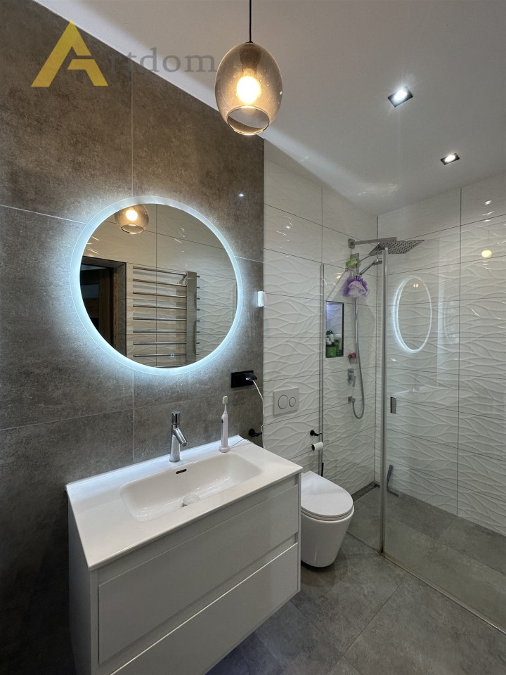 - nowoczesna łazienka wykończona w wysokiej jakości płytkach, wyposażona w przestronny prysznic