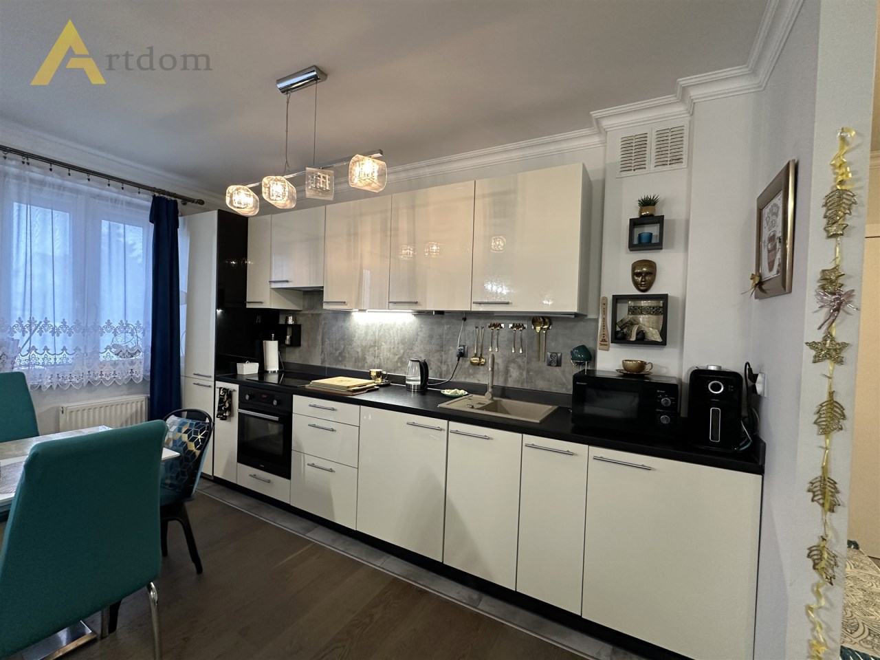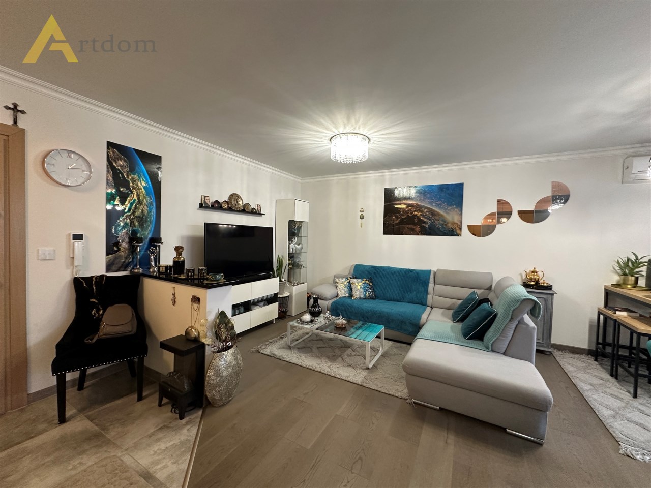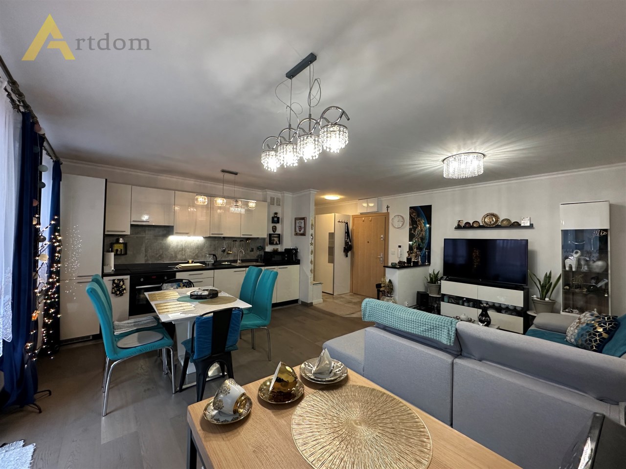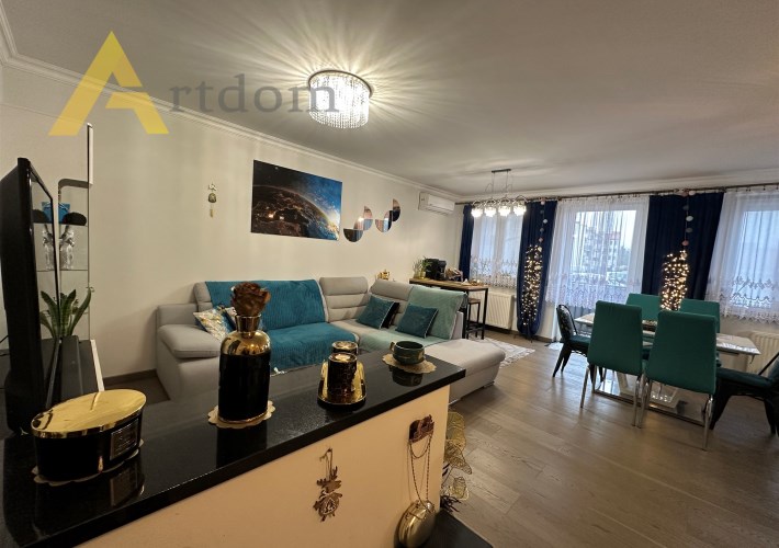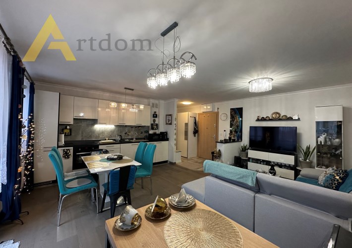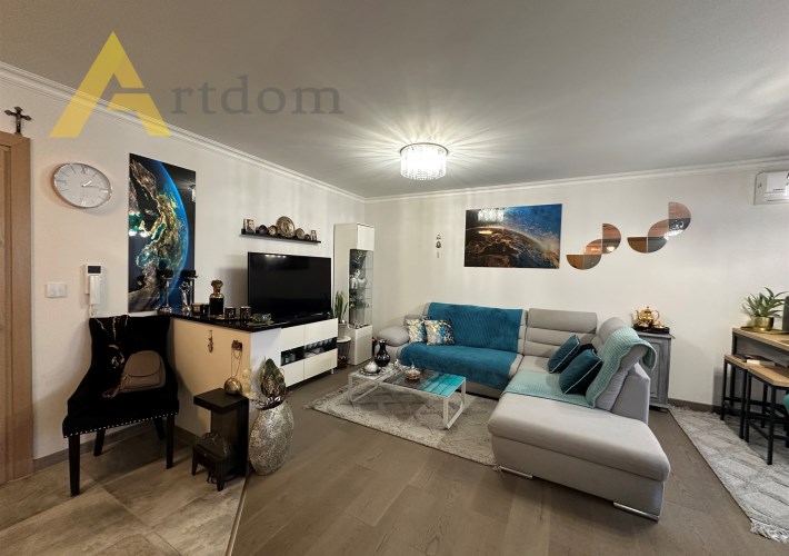Mieszkanie o powierzchni ok. 50 m² zostało zaprojektowane w otwartym układzie, który nadaje wnętrzu przestronności i lekkości. Centralnym punktem jest duży, jasny salon połączony z kuchnią, wykończony gustownie i z dbałością o detale.