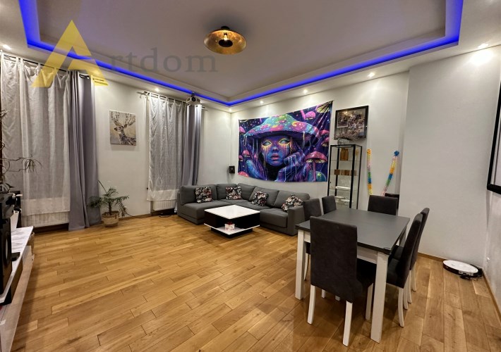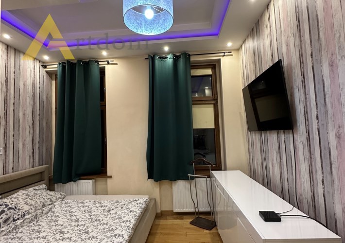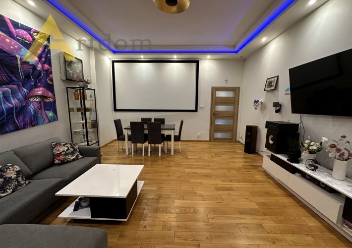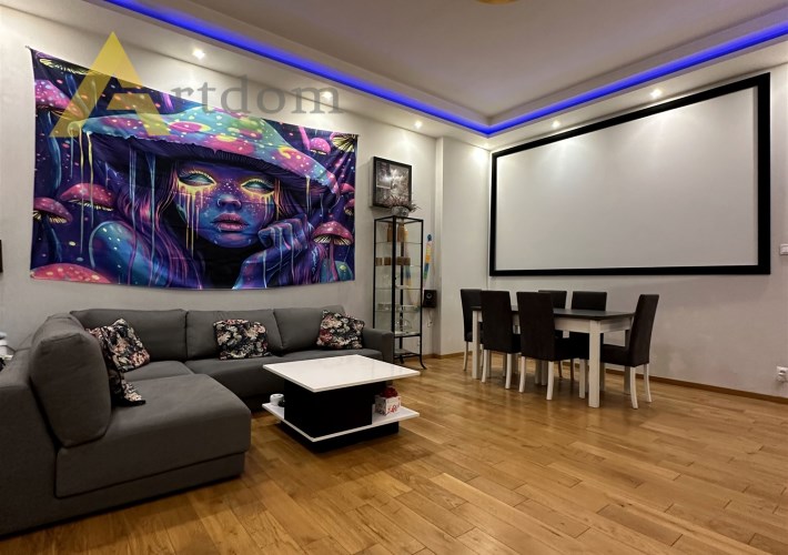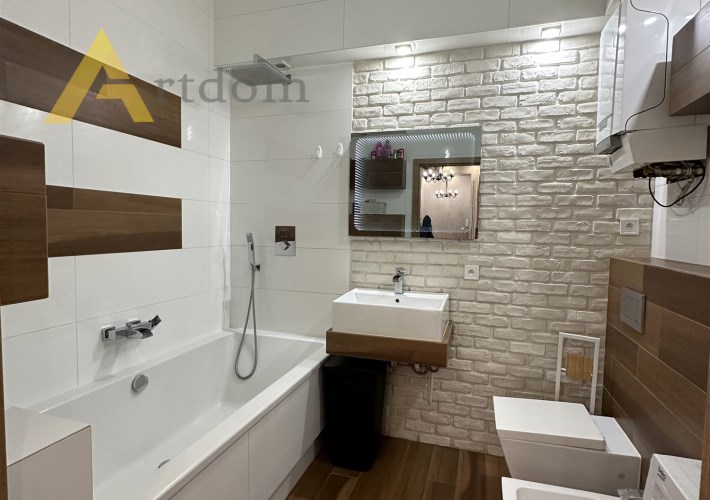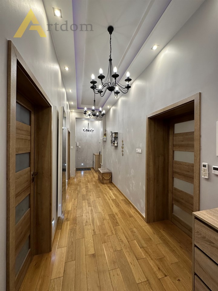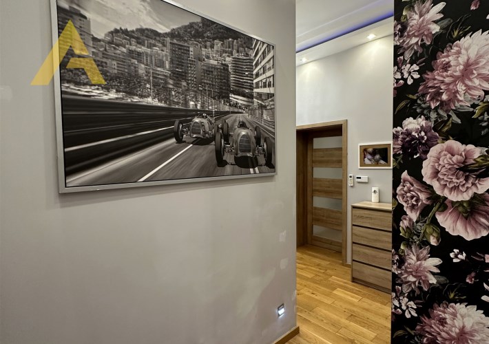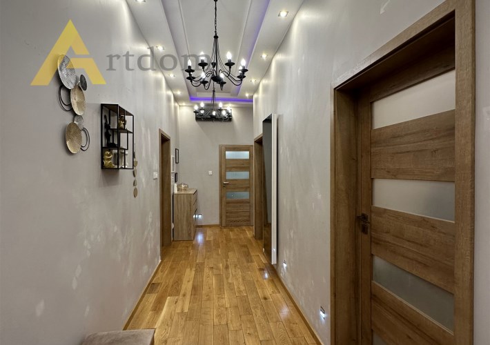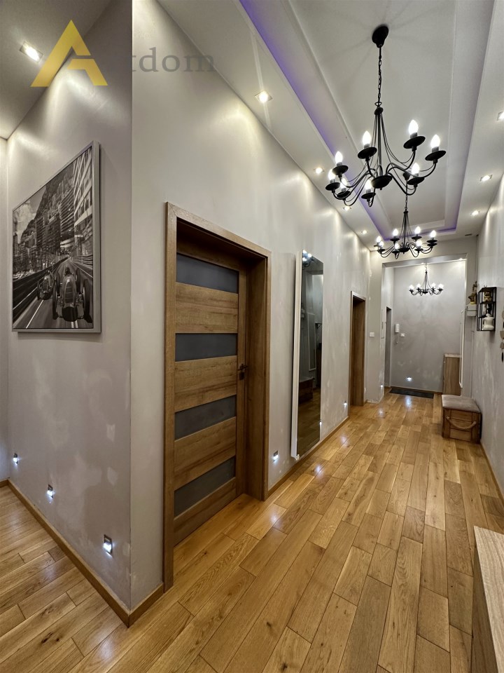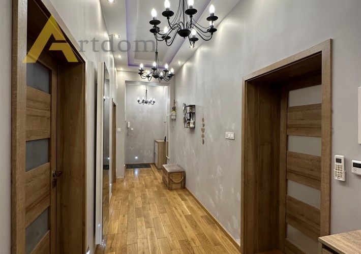 Centralnym punktem mieszkania jest salon w którym znajduję się wygodna część wypoczynkowa oraz stół jadalny. Do sypialni prowadzi długi przedpokój z klimatycznymi żyrandolami, ledami i halogenami. Sypialnie są usytuowane od podwórka co zapewnia 100 % spokój i intymność. W kuchni znajdziemy zabudowę meblową z pełnym sprzętem AGD (lodówka, zmywarka, piekarnik, płyta gazowa, mikrofala). Łazienka w modnych płytkach wyposażona jest w dużą, wygodną wannę z deszczownicą.