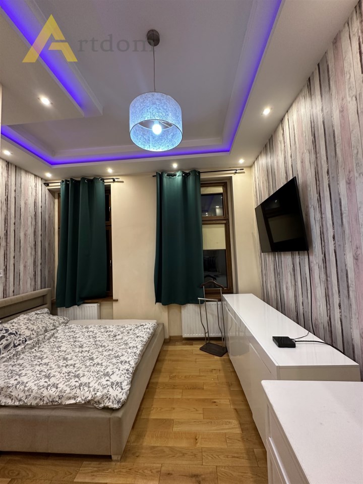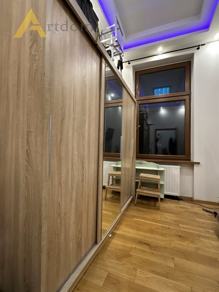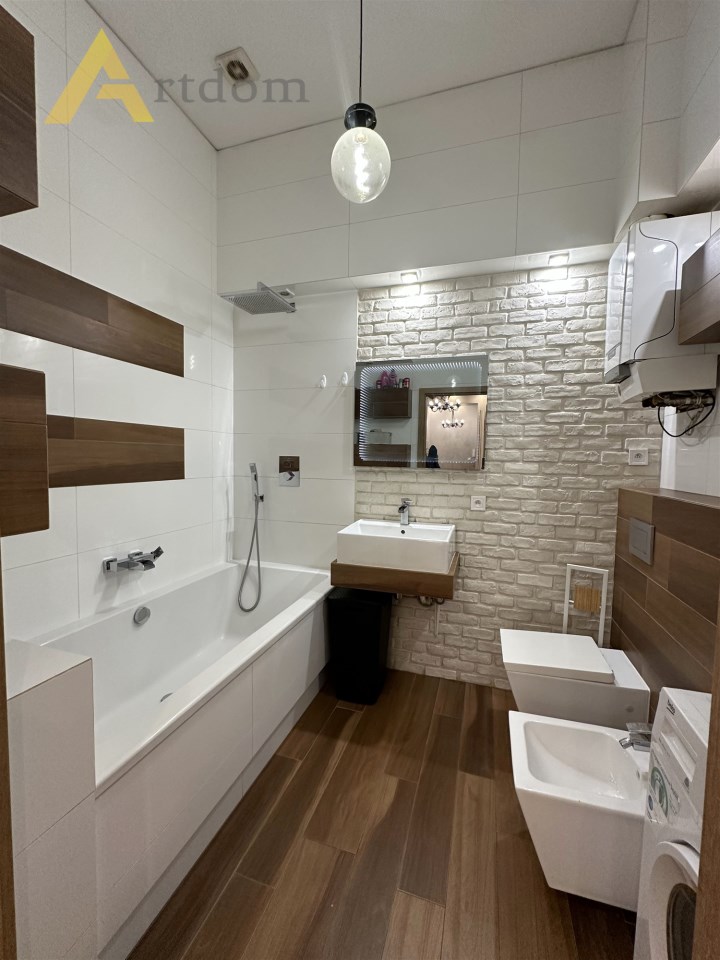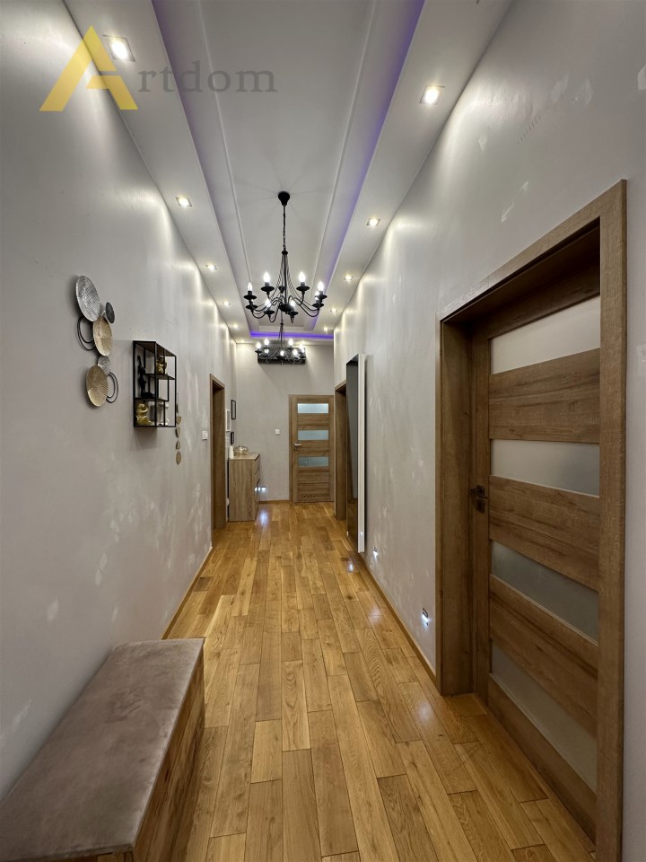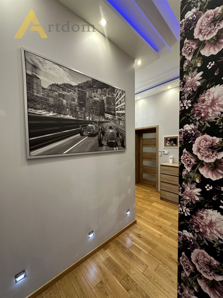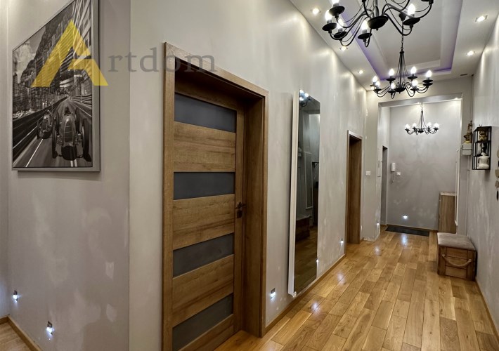 Centralnym punktem mieszkania jest salon w którym znajduję się wygodna część wypoczynkowa oraz stół jadalny. Do sypialni prowadzi długi przedpokój z klimatycznymi żyrandolami, ledami i halogenami. Sypialnie są usytuowane od podwórka co zapewnia 100 % spokój i intymność. W kuchni znajdziemy zabudowę meblową z pełnym sprzętem AGD (lodówka, zmywarka, piekarnik, płyta gazowa, mikrofala). Łazienka w modnych płytkach wyposażona jest w dużą, wygodną wannę z deszczownicą.